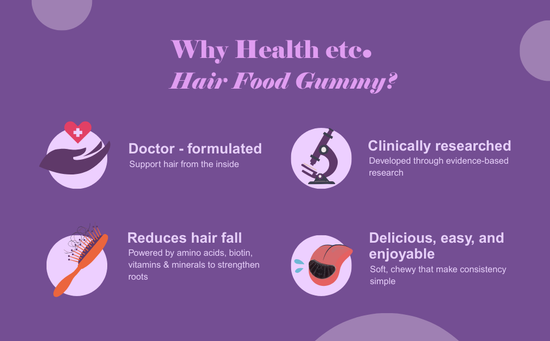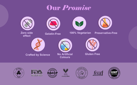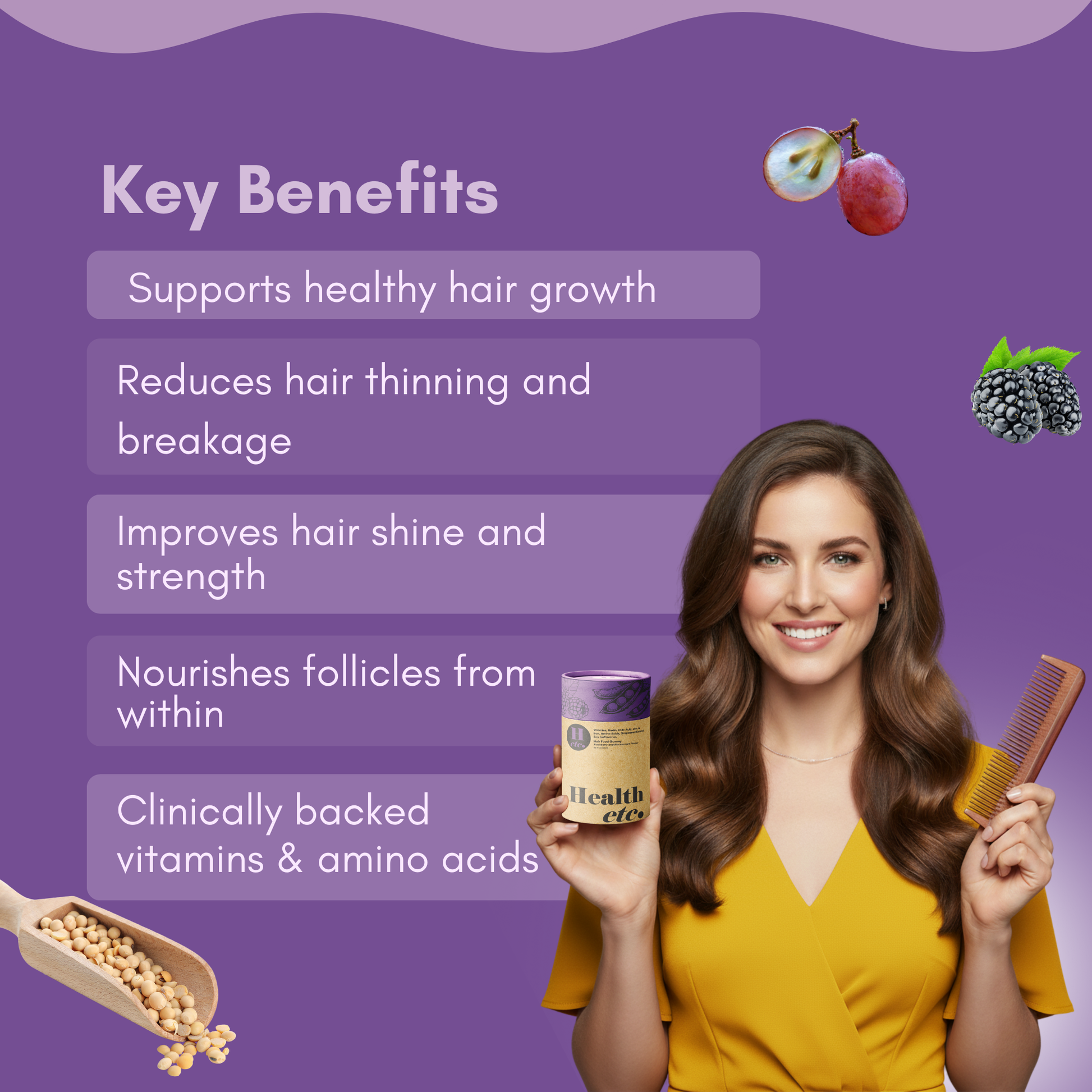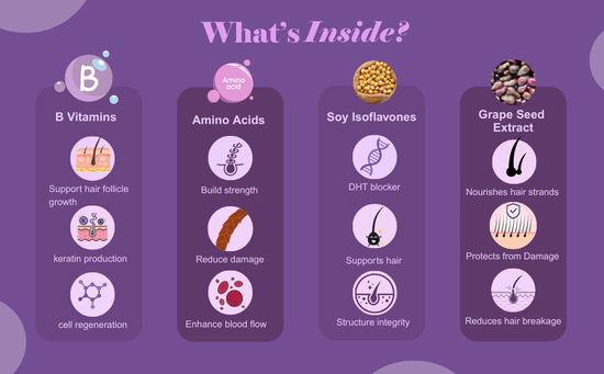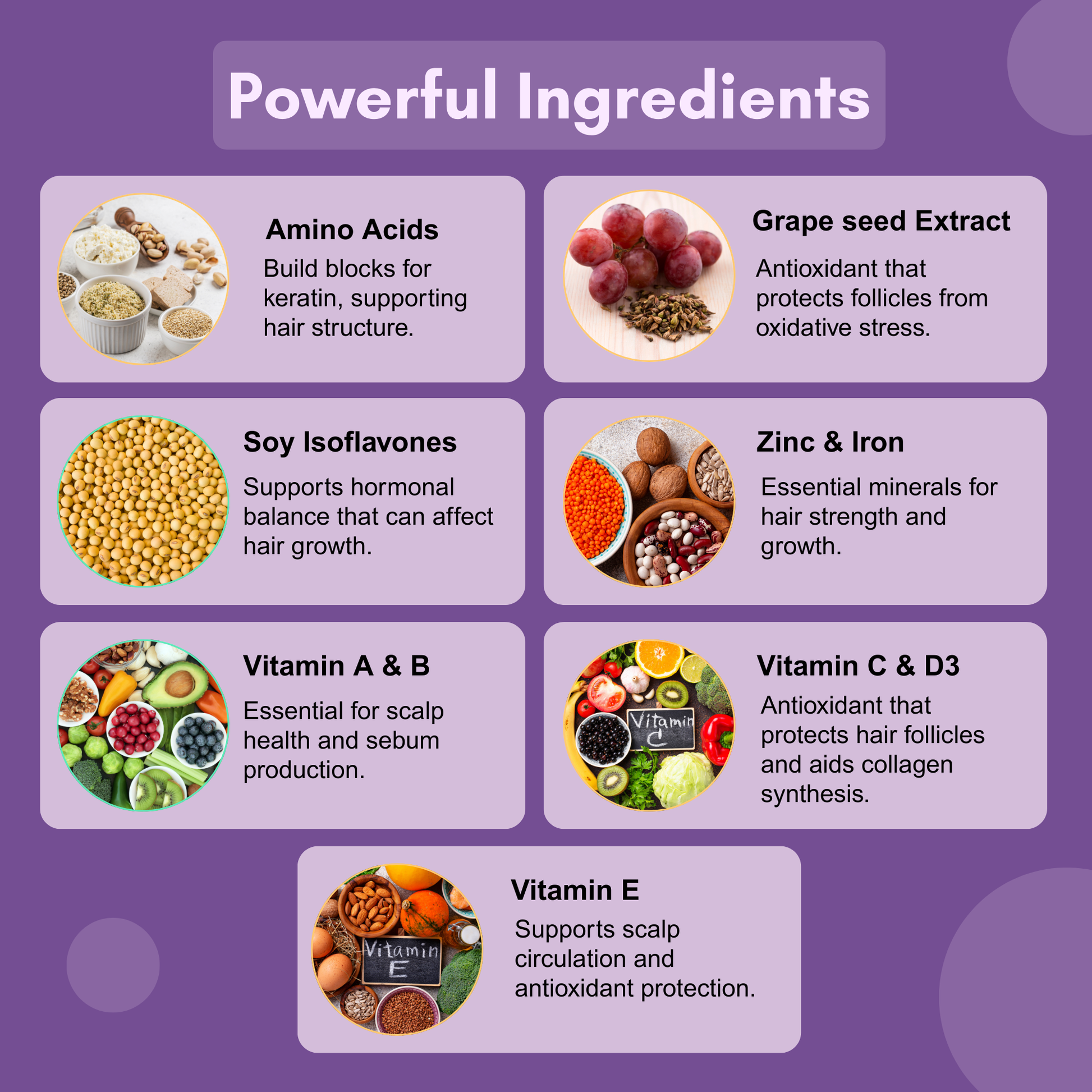 A combination of vitamins including A, B-complex (Niacin, B6, Biotin, Folic Acid), C, D3, and E — chosen for their studied roles in processes linked to skin, hair, and overall wellness.